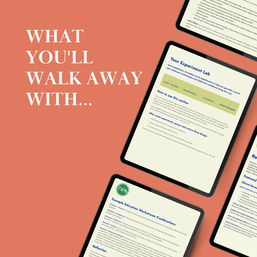 YOUR EXPERIMENT LAB - For each of your top workstreams, you'll find a set of low-stakes micro-experiments designed to move you from curiosity to direct experience. No financial outlay, no career change required - just practical ways to test whether a direction actually fits before you commit to it.